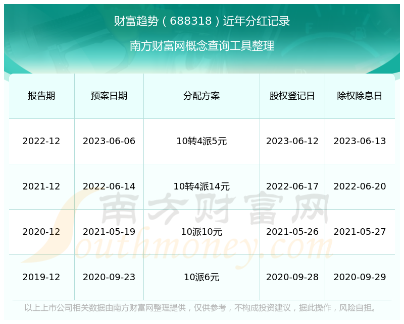 财富趋势最新一次公布的分红方案为10转4派5元。本次权益分派股权登记日为2023年6月12日,除权除息日为2023年6月13日,派息日为2023年6月13日。