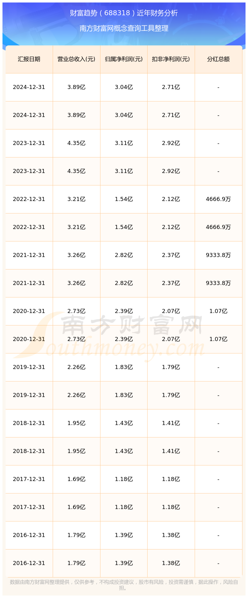 财富趋势历年分红派息情况如下表所示: