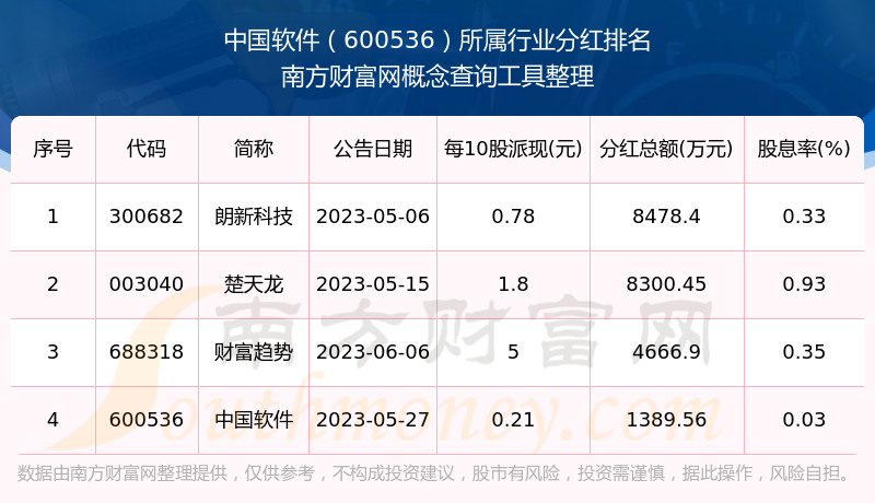 按照南方财富网趋势选股系统统计,中国软件所属行业为软件开发行业,软件开发行业分红排名情况如下表: