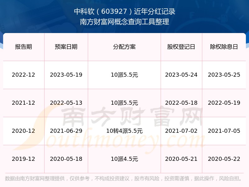 中科软最新一次公布的分红方案为10派5.5元。本次权益分派股权登记日为2023年5月24日,除权除息日为2023年5月25日,派息日为2023年5月25日。