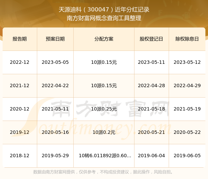 天源迪科最新一次公布的分红方案为10派0.15元。本次权益分派股权登记日为2023年5月11日,除权除息日为2023年5月12日,派息日为2023年5月12日。