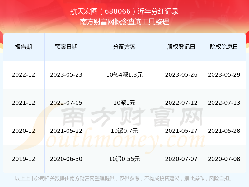 航天宏图最新一次公布的分红方案为10转4派1.3元。本次权益分派股权登记日为2023年5月26日,除权除息日为2023年5月29日,派息日为2023年5月29日。