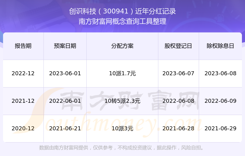 创识科技最新一次公布的分红方案为10派1.7元。本次权益分派股权登记日为2023年6月7日,除权除息日为2023年6月8日,派息日为2023年6月8日。