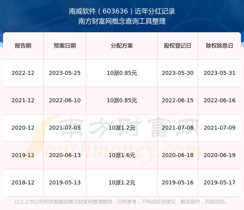 南威软件最新一次公布的分红方案为10派0.85元。本次权益分派股权登记日为2023年5月30日,除权除息日为2023年5月31日,派息日为2023年5月31日。