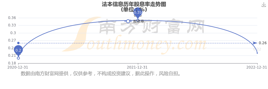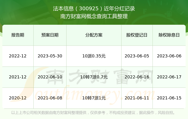 法本信息最新一次公布的分红方案为10派0.35元。本次权益分派股权登记日为2023年6月5日,除权除息日为2023年6月6日,派息日为2023年6月6日。