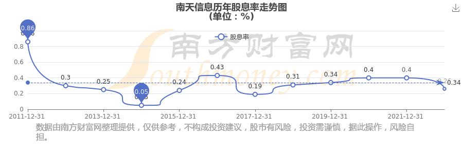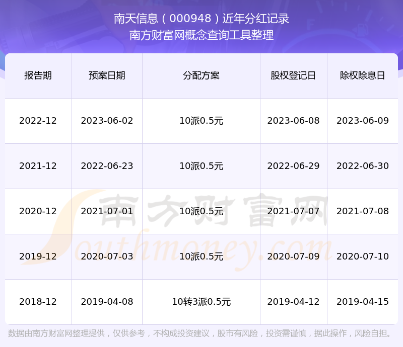 南天信息最新一次公布的分红方案为10派0.5元。本次权益分派股权登记日为2023年6月8日,除权除息日为2023年6月9日,派息日为2023年6月9日。