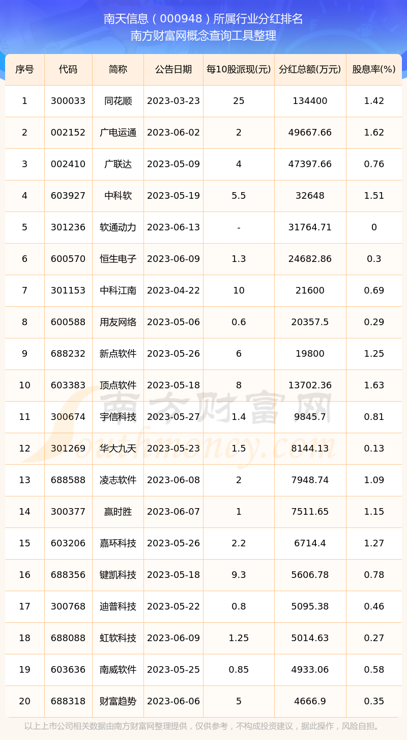 按照南方财富网趋势选股系统统计,南天信息所属行业为软件开发行业,软件开发行业分红排名情况如下表: