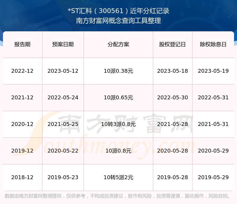 *ST汇科最新一次公布的分红方案为10派0.38元。本次权益分派股权登记日为2023年5月18日,除权除息日为2023年5月19日,派息日为2023年5月19日。