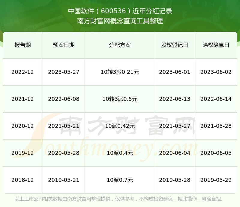 中国软件最新一次公布的分红方案为10转3派0.21元。本次权益分派股权登记日为2023年6月1日,除权除息日为2023年6月2日,派息日为2023年6月2日。