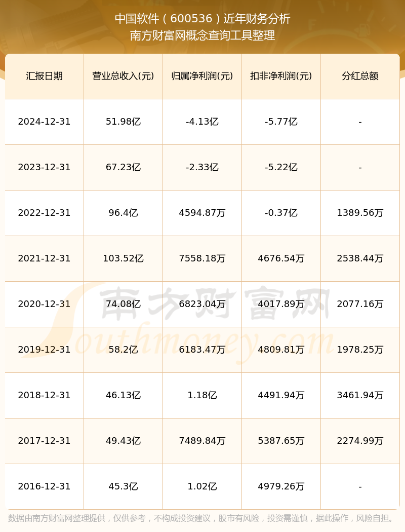 中国软件2024年总营收51.98亿,同比增长-22.69%;净利润-4.13亿,同比增长-77.29%;销售毛利率37.42%。
