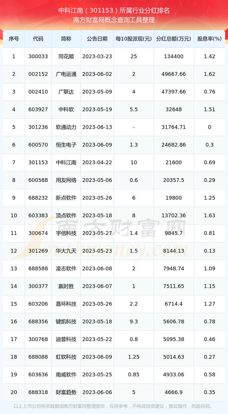 按照南方财富网趋势选股系统统计,中科江南所属行业为软件开发行业,软件开发行业分红排名情况如下表: