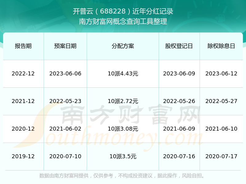 开普云最新一次公布的分红方案为10派4.43元。本次权益分派股权登记日为2023年6月9日,除权除息日为2023年6月12日,派息日为2023年6月12日。