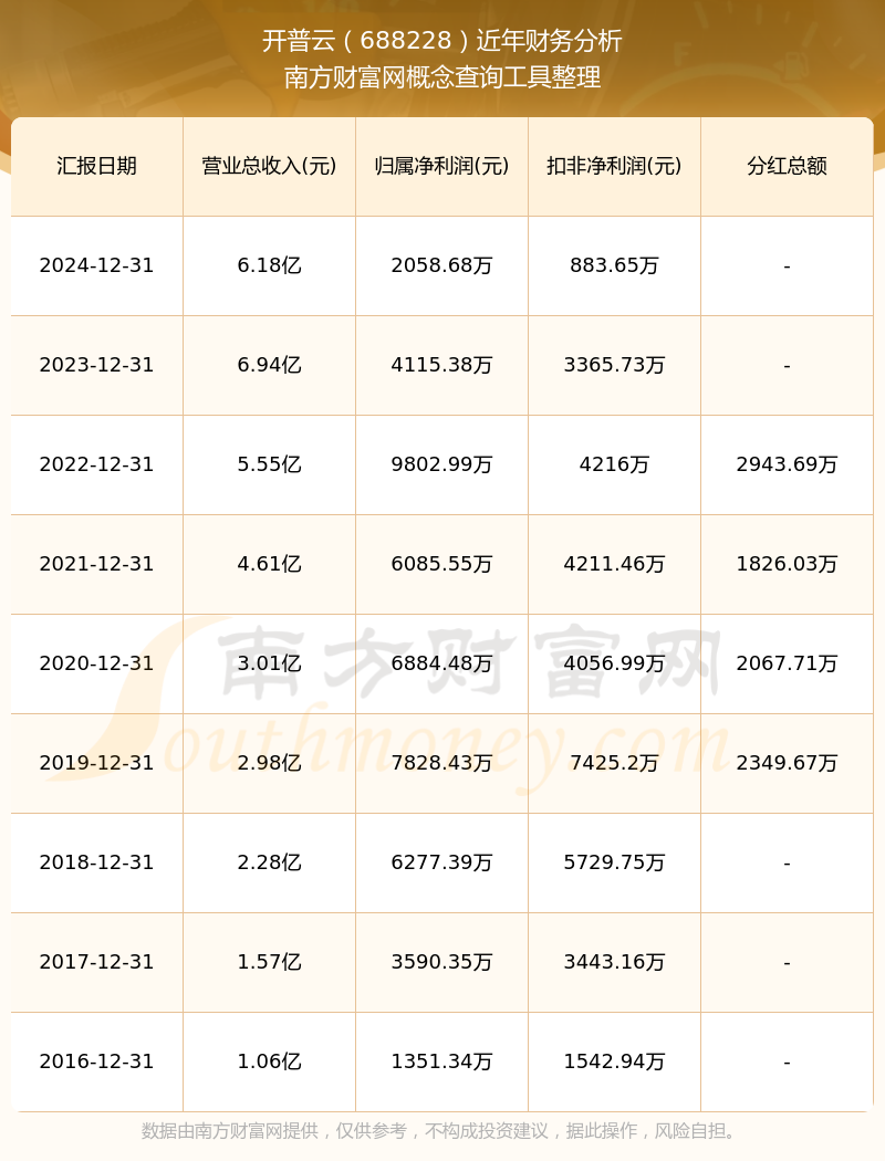 2024年开普云总营收6.18亿,同比增长-10.98%;净利润2058.68万,同比增长-49.98%;销售毛利率37.51%。