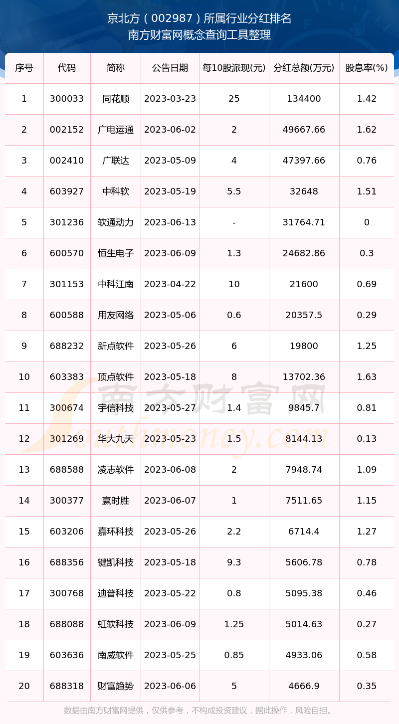 按照南方财富网趋势选股系统统计,京北方所属行业为软件开发行业,软件开发行业分红排名情况如下表: