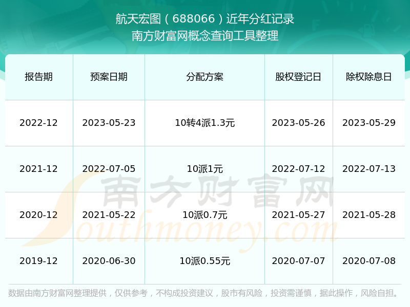 航天宏图最新一次公布的分红方案为10转4派1.3元。本次权益分派股权登记日为2023年5月26日,除权除息日为2023年5月29日,派息日为2023年5月29日。