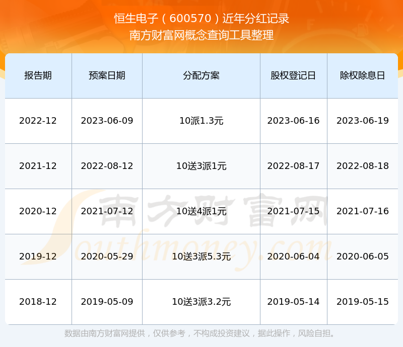 恒生电子最新一次公布的分红方案为10派1.3元。本次权益分派股权登记日为2023年6月16日,除权除息日为2023年6月19日,派息日为2023年6月19日。