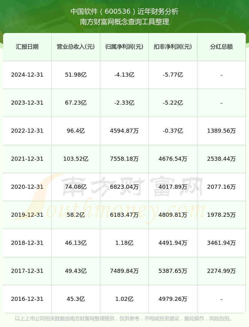 2024年中国软件总营收51.98亿,同比增长-22.69%;净利润-4.13亿,同比增长-77.29%;销售毛利率37.42%。