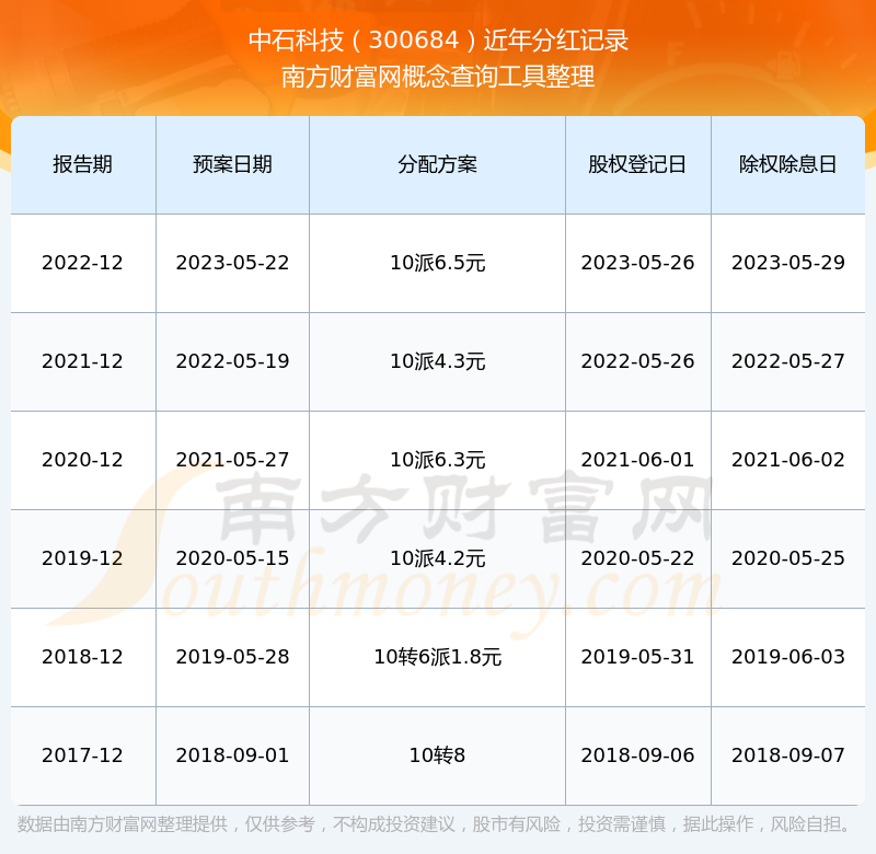 中石科技最新一次公布的分红方案为10派6.5元。本次权益分派股权登记日为2023年5月26日,除权除息日为2023年5月29日,派息日为2023年5月29日。