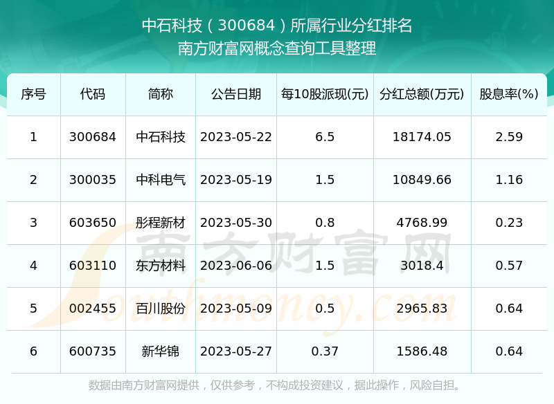 按照南方财富网趋势选股系统统计,中石科技所属行业为导热材料行业,导热材料行业分红排名情况如下表: