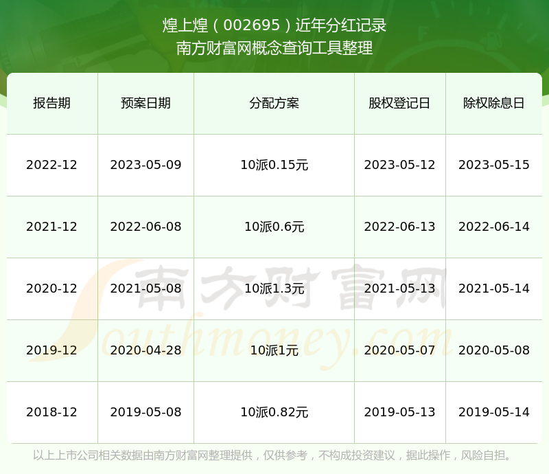 煌上煌最新一次公布的分红方案为10派0.15元。本次权益分派股权登记日为2023年5月12日,除权除息日为2023年5月15日,派息日为2023年5月15日。