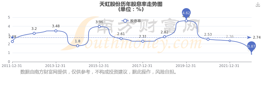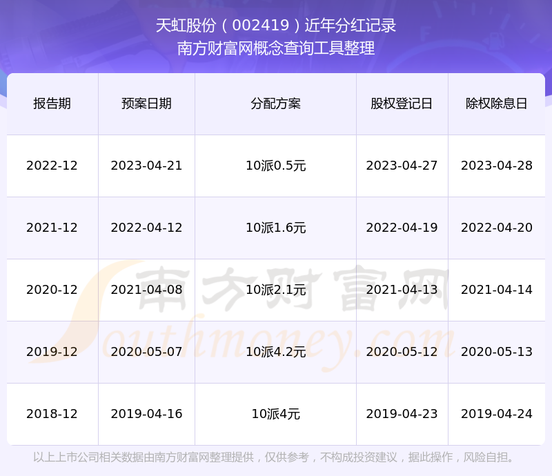 天虹股份最新一次公布的分红方案为10派0.5元。本次权益分派股权登记日为2023年4月27日,除权除息日为2023年4月28日,派息日为2023年4月28日。