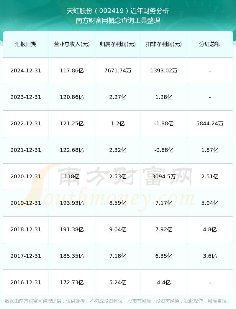 2024年天虹股份总营收117.86亿,同比增长-2.49%;净利润7671.74万,同比增长-66.16%;销售毛利率36.89%。