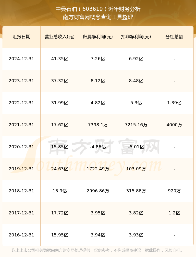2024年报显示,中曼石油实现营收41.35亿,同比增长10.79%;净利润7.26亿,同比增长-10.58%;毛利率46%。