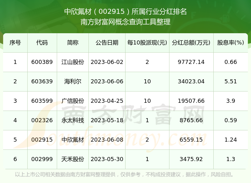 按照南方财富网趋势选股系统统计,中欣氟材所属行业为农药行业,农药行业分红排名情况如下表: