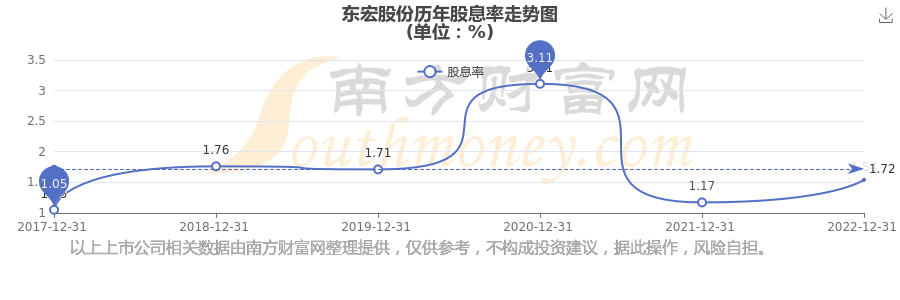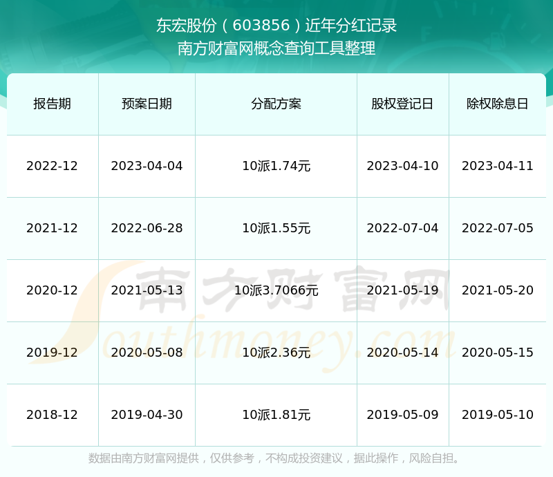 东宏股份最新一次公布的分红方案为10派1.74元。本次权益分派股权登记日为2023年4月10日,除权除息日为2023年4月11日,派息日为2023年4月11日。