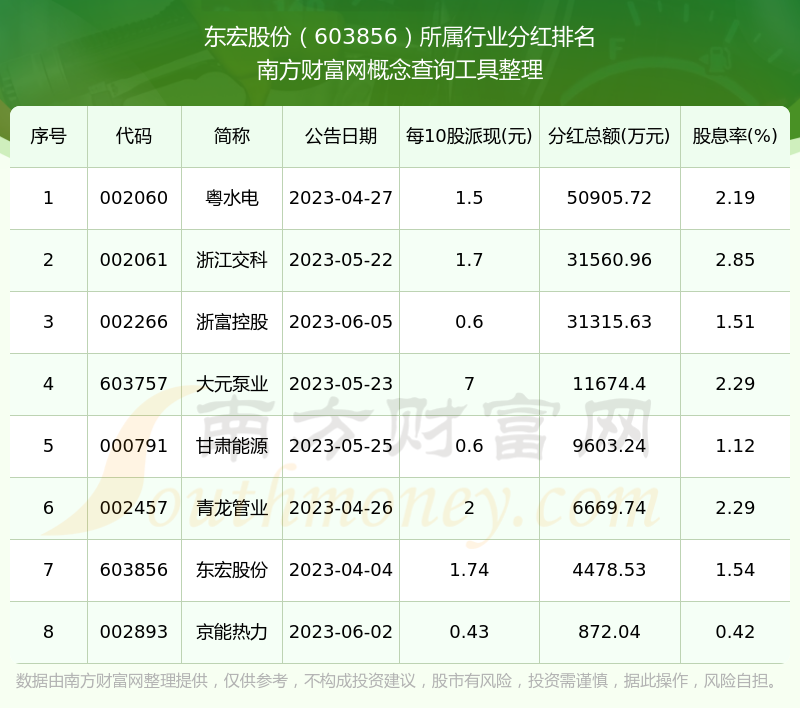 按照南方财富网趋势选股系统统计,东宏股份所属行业为装修建材行业,装修建材行业分红排名情况如下表:
