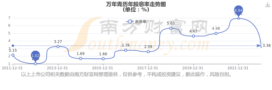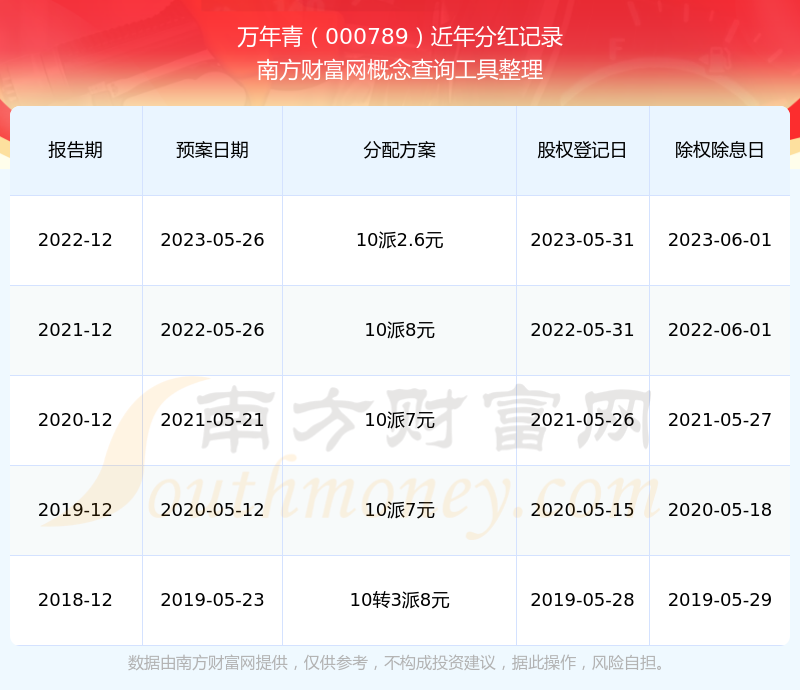 万年青最新一次公布的分红方案为10派2.6元。本次权益分派股权登记日为2023年5月31日,除权除息日为2023年6月1日,派息日为2023年6月1日。
