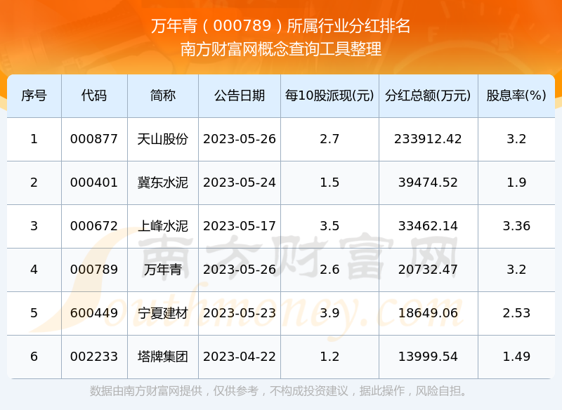 按照南方财富网趋势选股系统统计,万年青所属行业为水泥行业,水泥行业分红排名情况如下表: