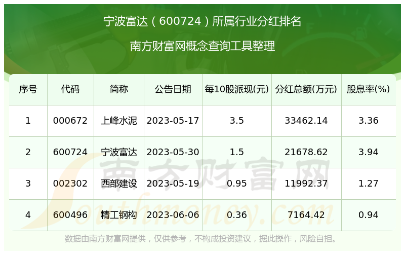 按照南方财富网趋势选股系统统计,宁波富达所属行业为水泥建材行业,水泥建材行业分红排名情况如下表: