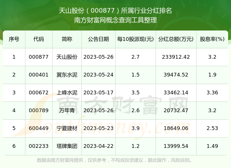 按照南方财富网趋势选股系统统计,天山股份所属行业为水泥行业,水泥行业分红排名情况如下表: