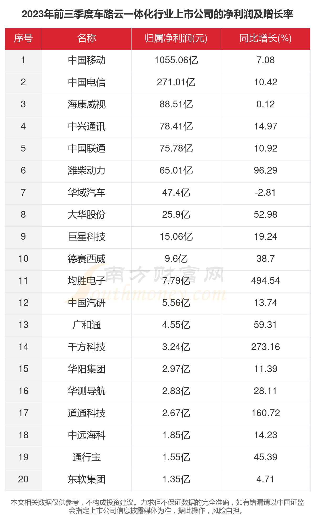 根据南方财富网概念查询工具数据统计,2023年前三季度,53家车路云一体化行业上市公司的2023年前三季度归属净利润合计为1736.21亿元,同比增长9.16%。其中,2023年前三季度归属净利润前三的车路云一体化行业上市公司为:中国移动、中国电信、海康威视。
