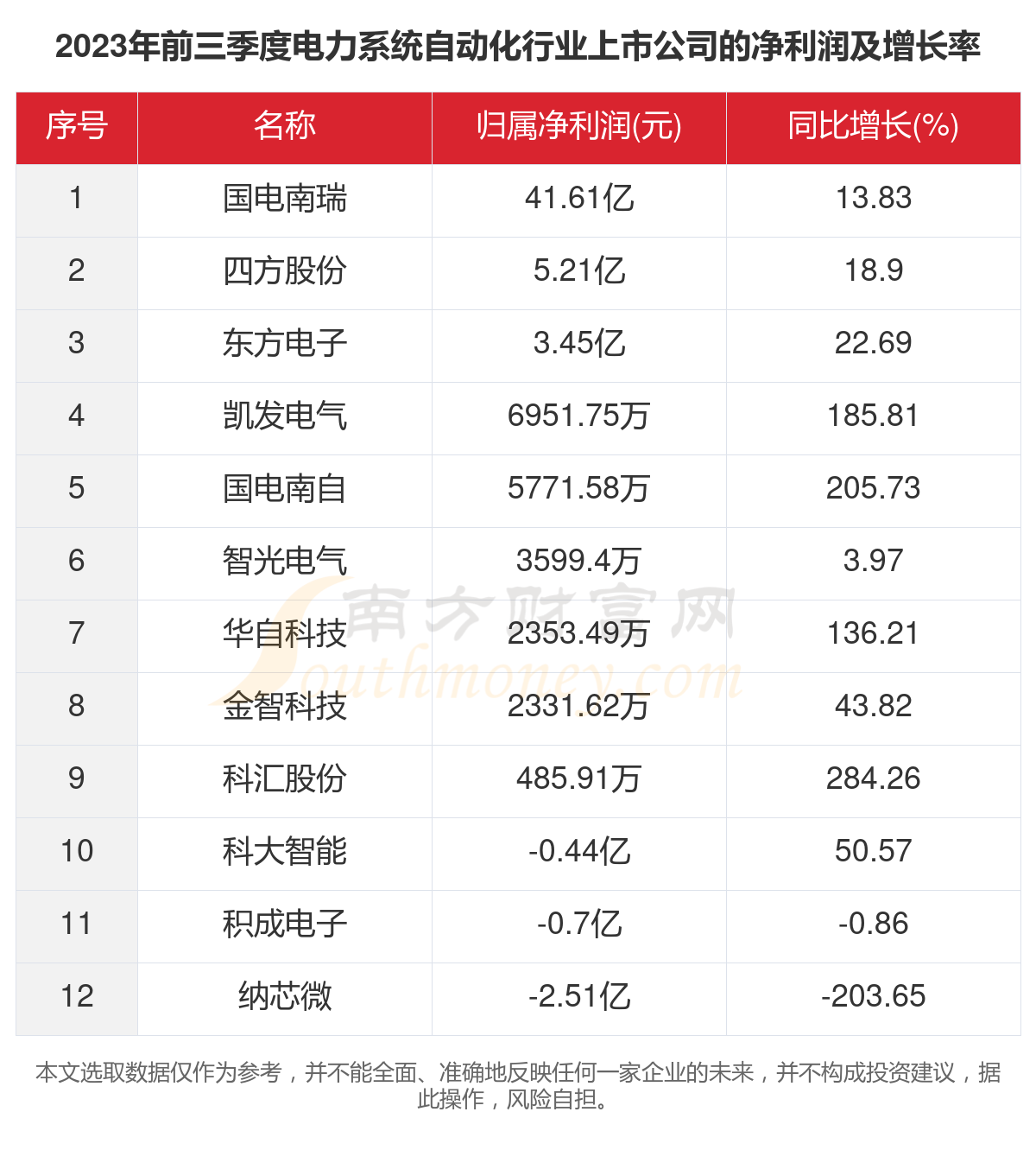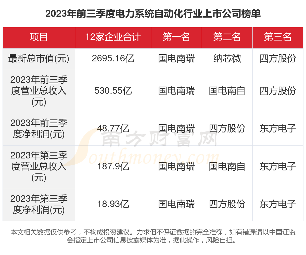根据南方财富网概念查询工具数据统计,2023年前三季度,12家电力系统自动化行业上市公司的2023年前三季度归属净利润合计为48.77亿元,同比增长8.74%。其中,2023年前三季度归属净利润前三的电力系统自动化行业上市公司为:国电南瑞、四方股份、东方电子。