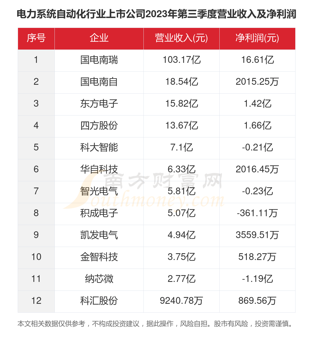 本文统计了A股12家电力系统自动化行业上市公司的2023年前三季度的营业收入、净利润,2023年第三季度的营业收入、净利润,以及最新的市值情况。