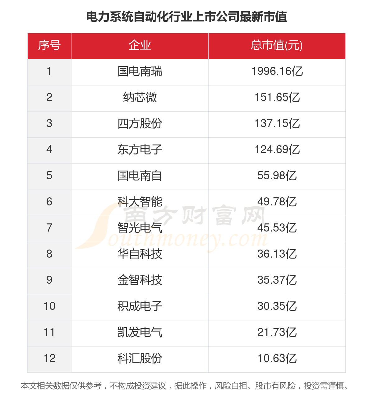根据3月8日的收盘价格,A股12家电力系统自动化行业上市公司的当前总市值合计为2695.16亿元。其中,市值最高的三家电力系统自动化行业上市公司为:国电南瑞、纳芯微、四方股份。