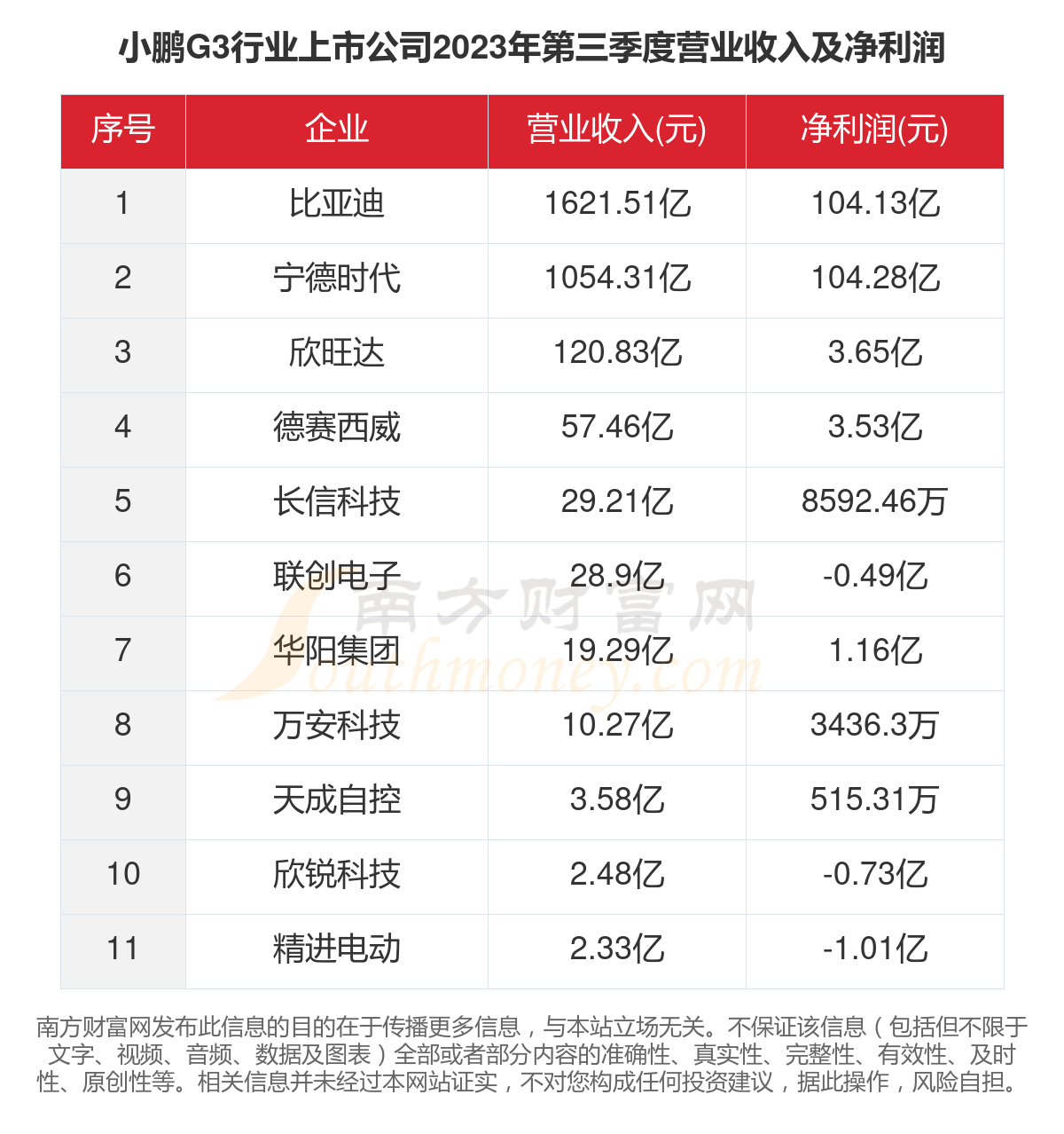 其中,2023年第三季度营业收入前三的小鹏G3行业上市公司为:比亚迪、宁德时代、欣旺达。