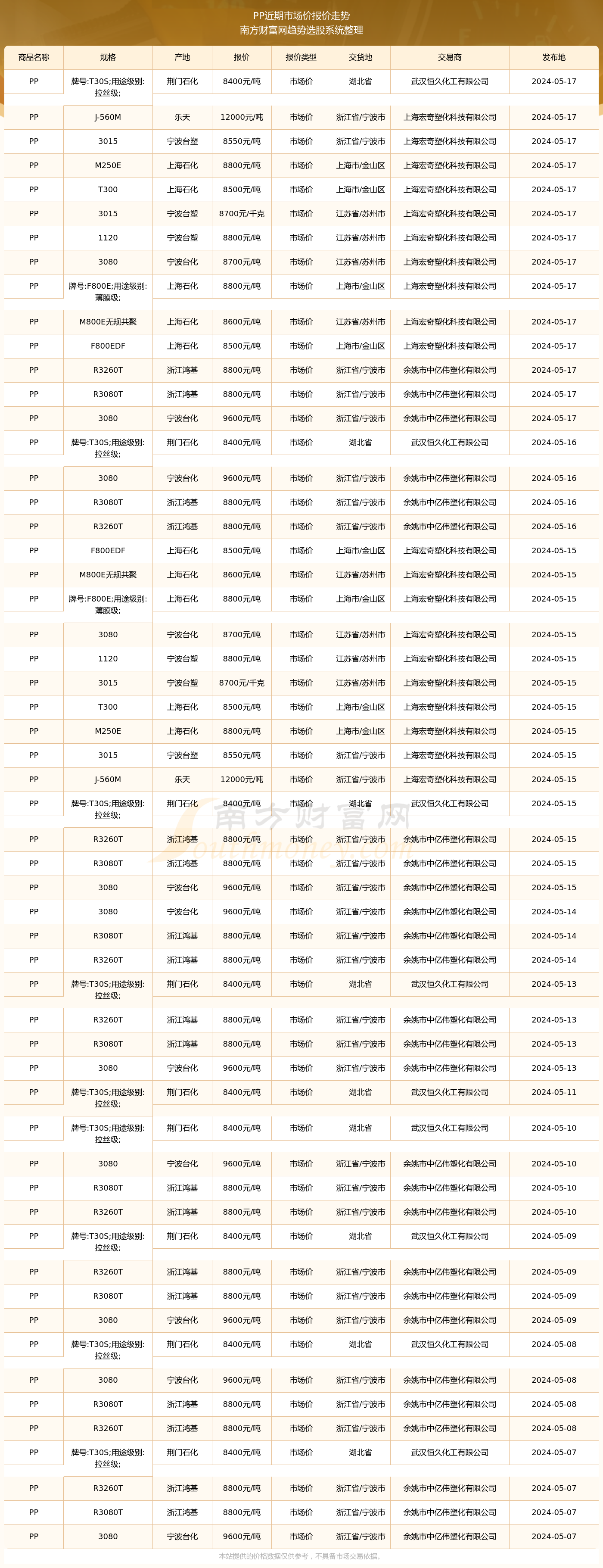 2024年5月17日,武汉恒久化工有限公司PP(牌号:T30S;用途级别:拉丝级;),荆门石化,交易地点为湖北省,市场价报价为8400.00元/吨。