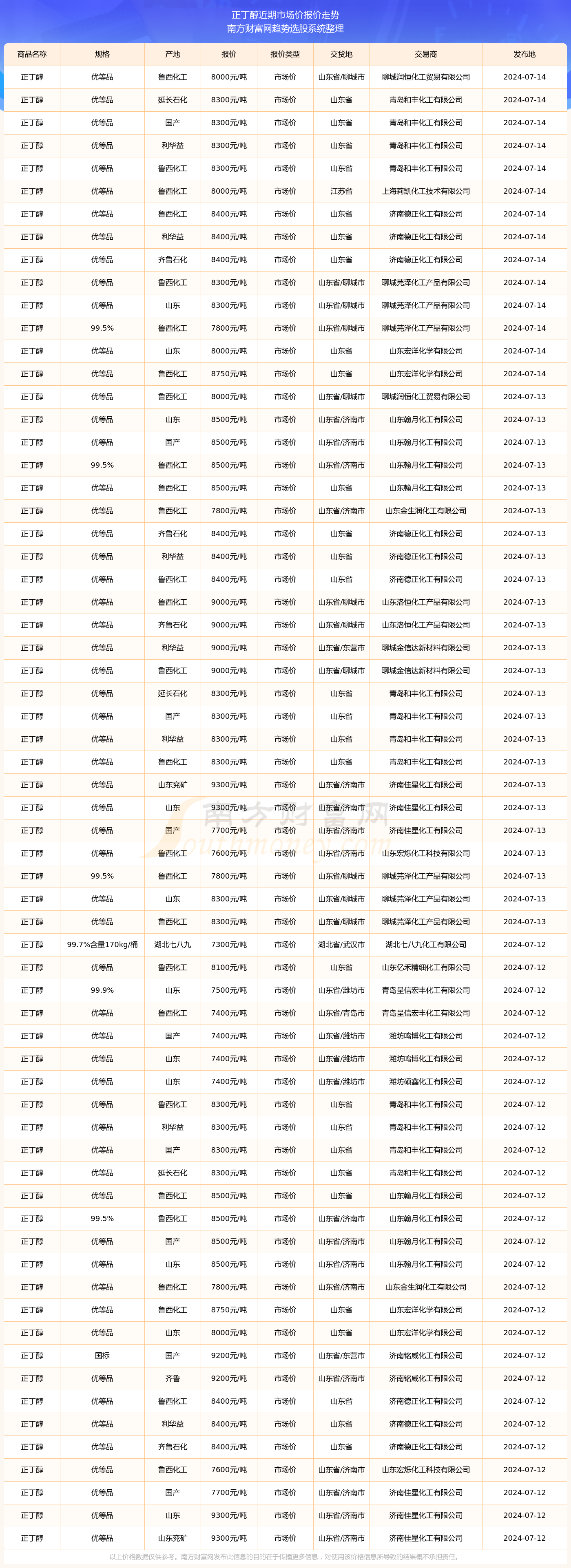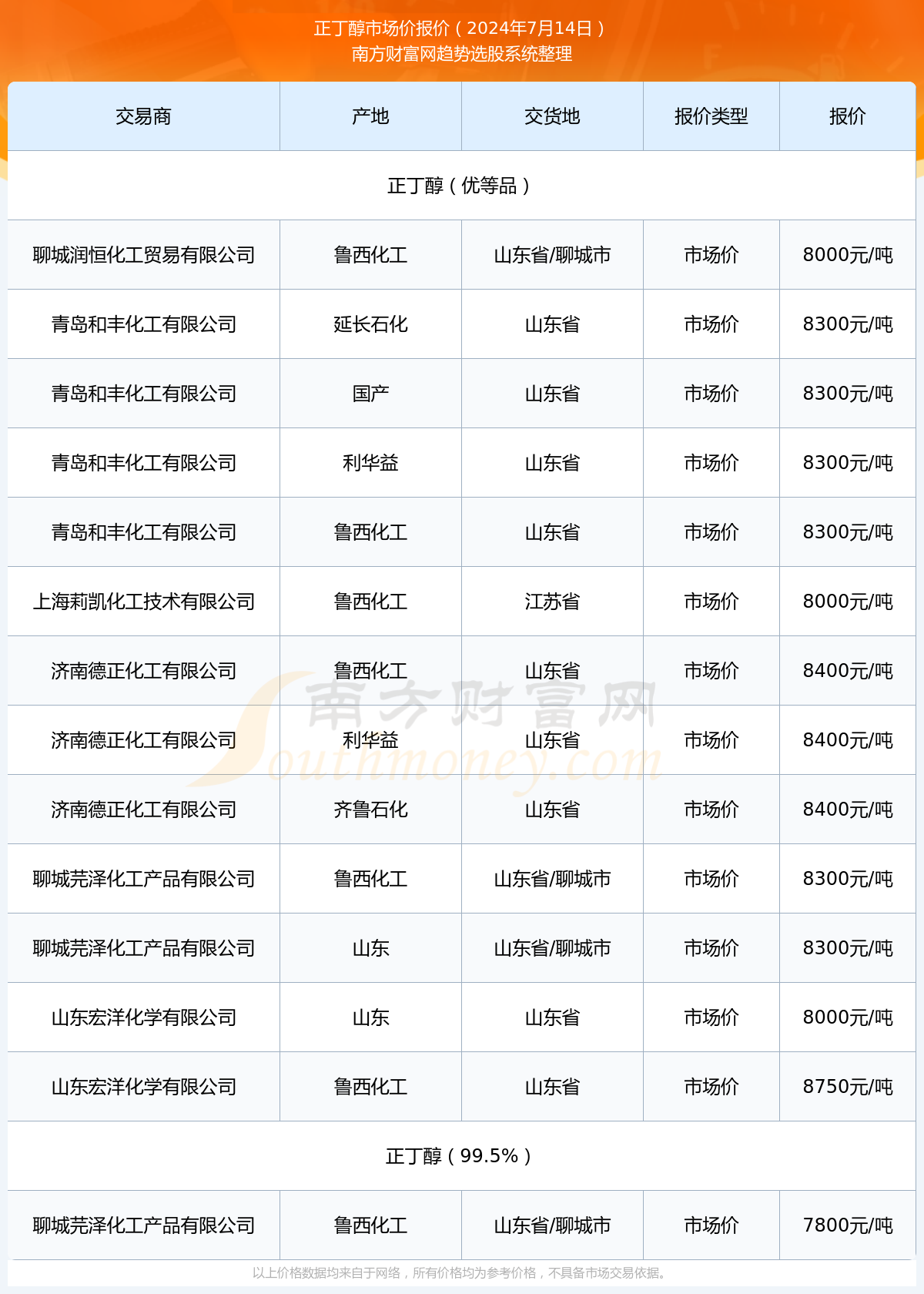 2024年7月14日,聊城润恒化工贸易有限公司正丁醇(优等品),鲁西化工,交易地点为山东省/聊城市,市场价报价为8000.00元/吨。