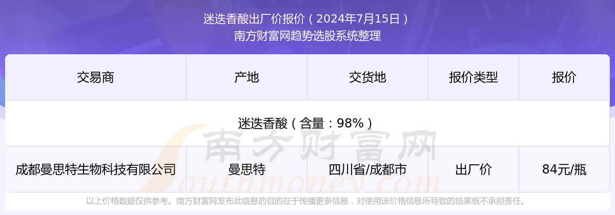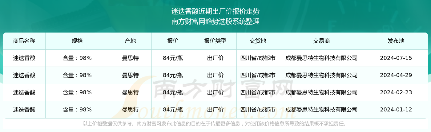 2024年7月15日,成都曼思特生物科技有限公司迷迭香酸(含量:98%),曼思特,交易地点为四川省/成都市,出厂价报价为84.00元/瓶。