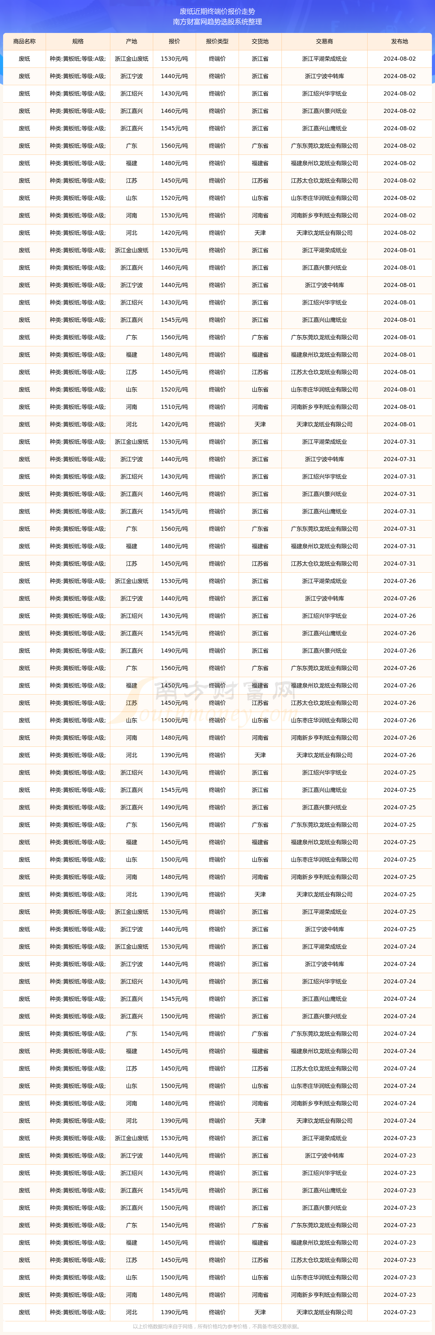 2024年8月2日,废纸(种类:黄板纸;等级:A级;)终端价价格为1530.00元/吨,报价人:浙江平湖荣成纸业,交易地点为浙江省。