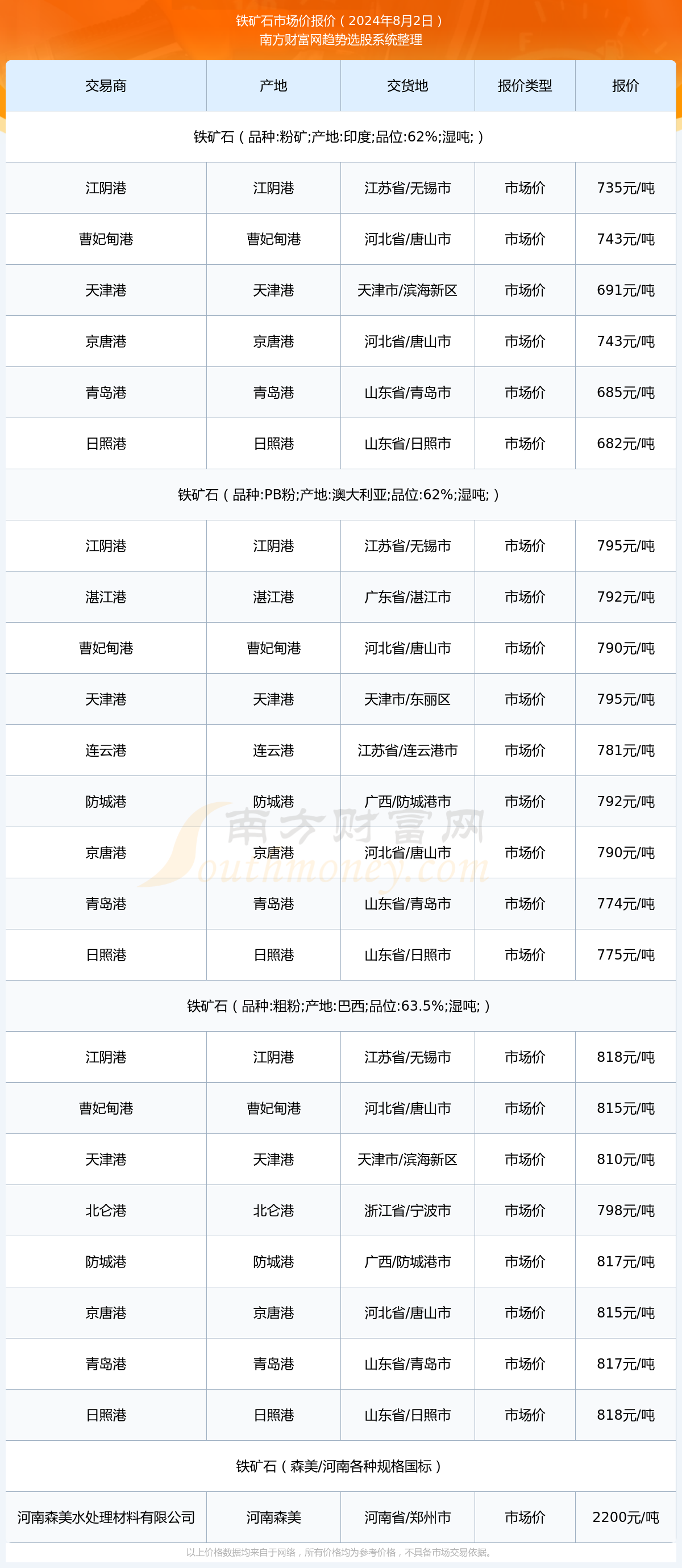2024年8月2日,江阴港铁矿石(品种:粉矿;产地:印度;品位:62%;湿吨;),江阴港,交易地点为江苏省/无锡市,市场价报价为735.00元/吨。