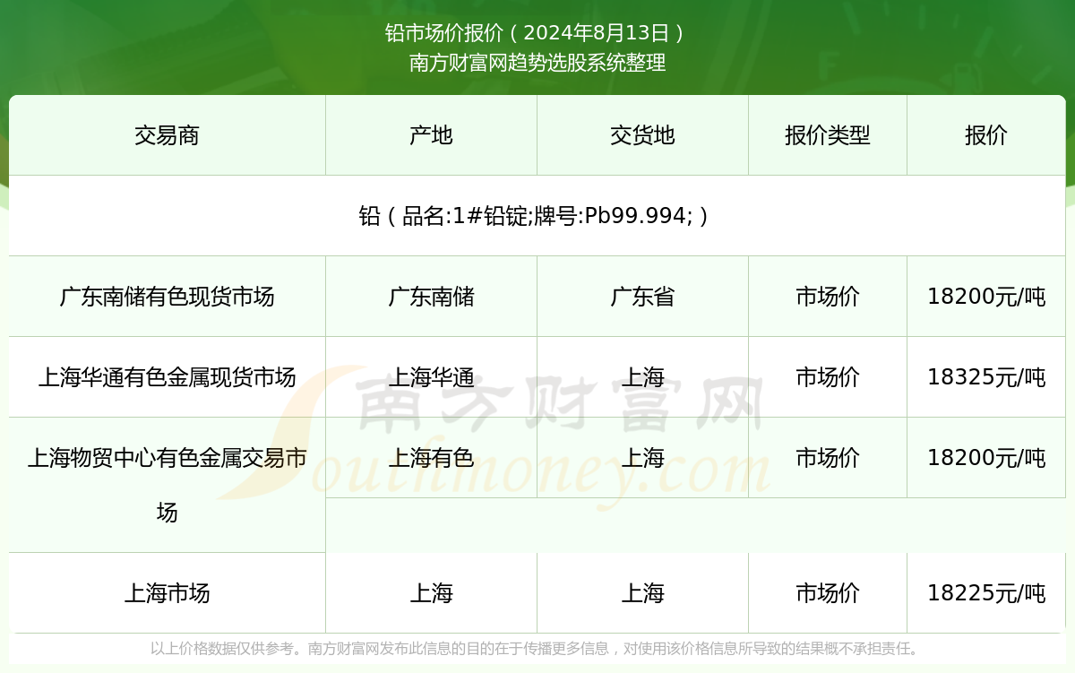 2024年8月13日,铅(品名:1#铅锭;牌号:Pb99.994;)市场价价格为18325.00元/吨,报价人:上海华通有色金属现货市场,交易地点为上海。