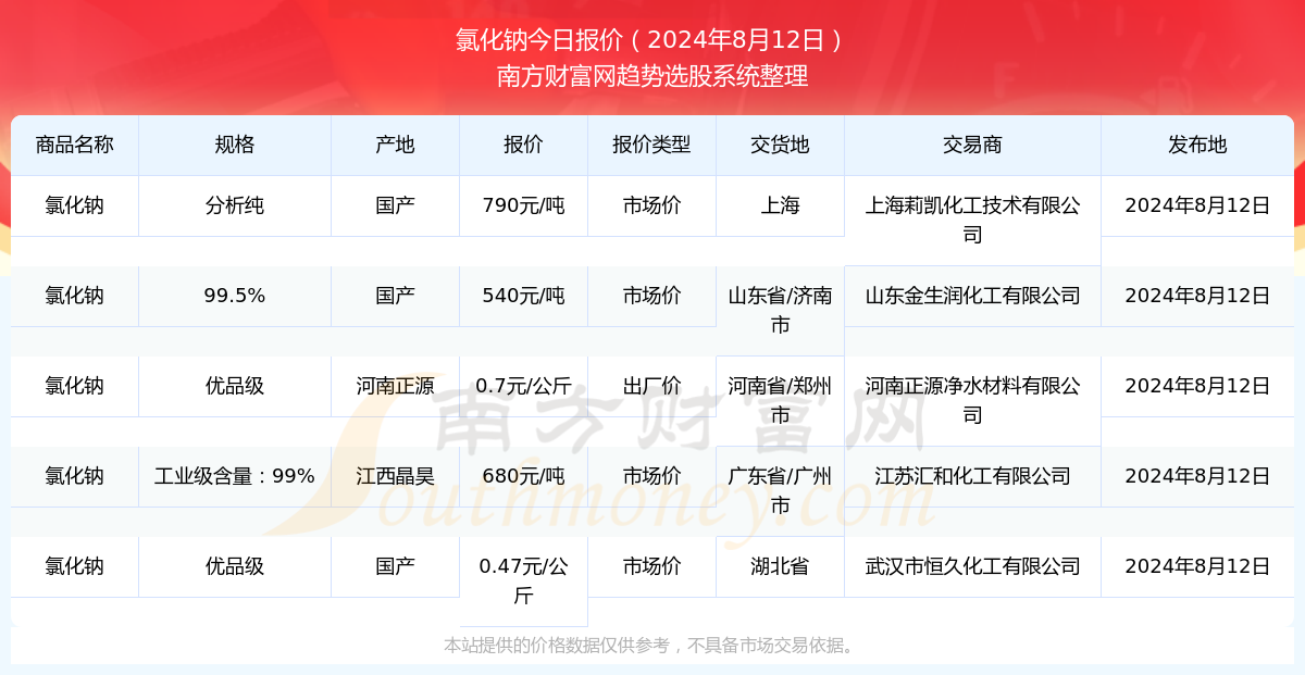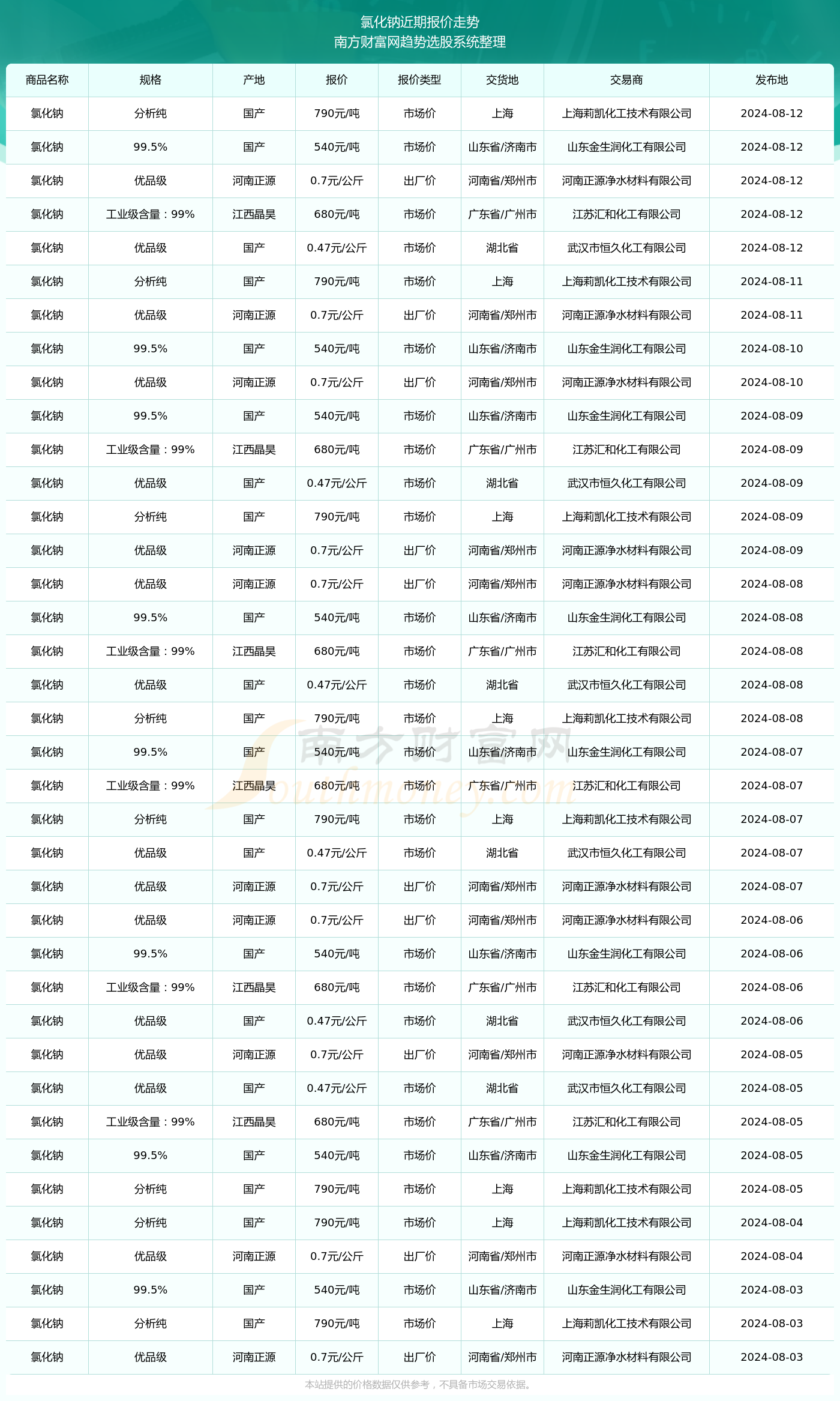 2024年8月12日,山东金生润化工有限公司氯化钠(99.5%),国产,交易地点为山东省/济南市,报价为540.00元/吨。