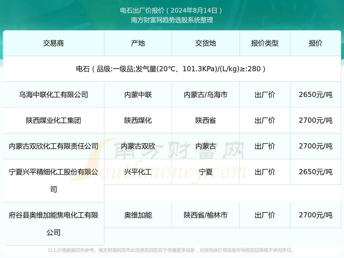 2024年8月14日,乌海中联化工有限公司电石(品级:一级品;发气量(20℃、101.3KPa)/(L/kg)≥:280),内蒙中联,交易地点为内蒙古/乌海市,出厂价报价为2650.00元/吨。