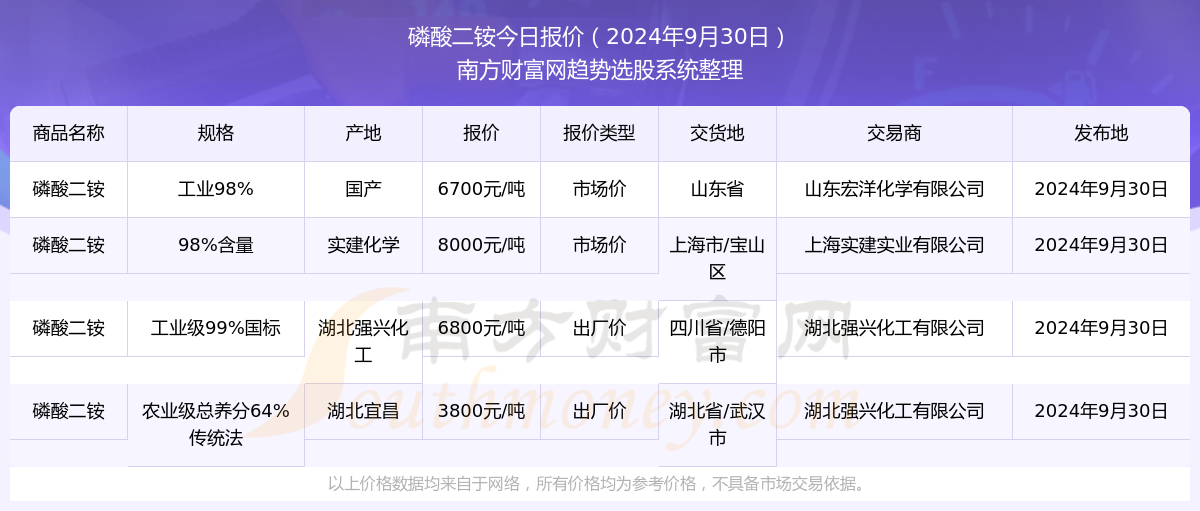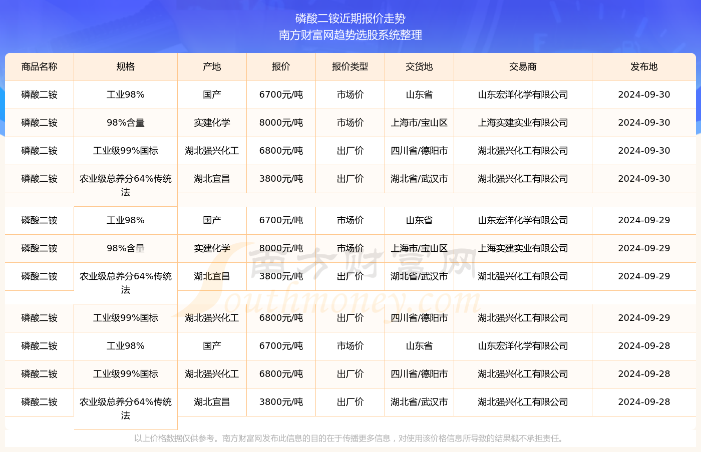 2024年9月30日,磷酸二铵(工业98%)价格为6700.00元/吨,报价人:山东宏洋化学有限公司,交易地点为山东省。