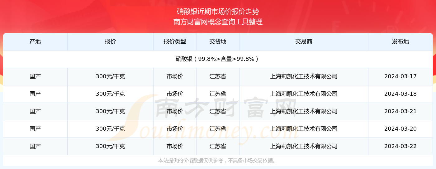 2024年3月22日,上海莉凯化工技术有限公司硝酸银(99.8%>含量>99.8%),国产,交易地点为江苏省,市场价报价为300.00元/千克。