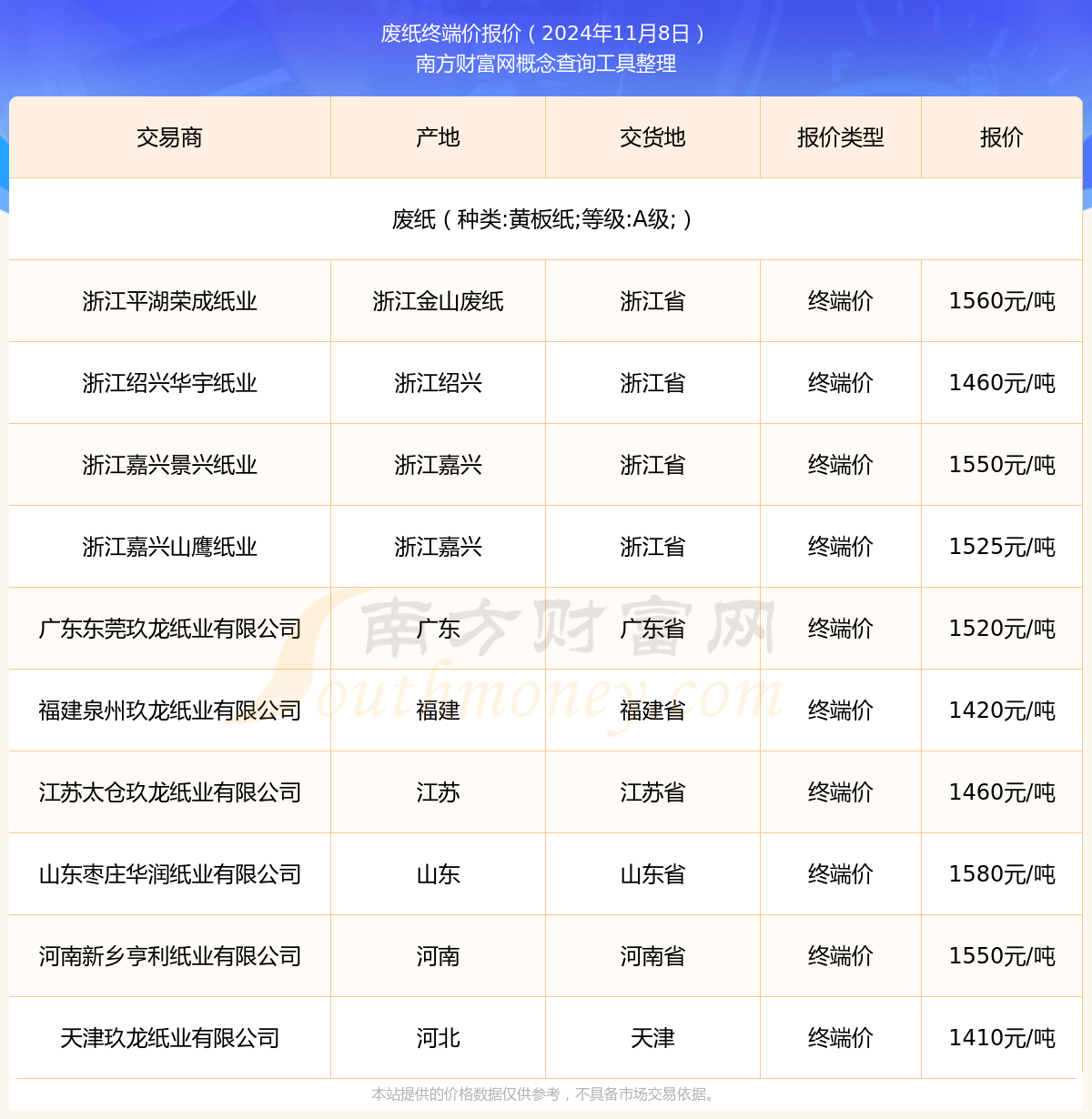 2024年11月8日,废纸(种类:黄板纸;等级:A级;)终端价价格为1550.00元/吨,报价人:浙江嘉兴景兴纸业,交易地点为浙江省。